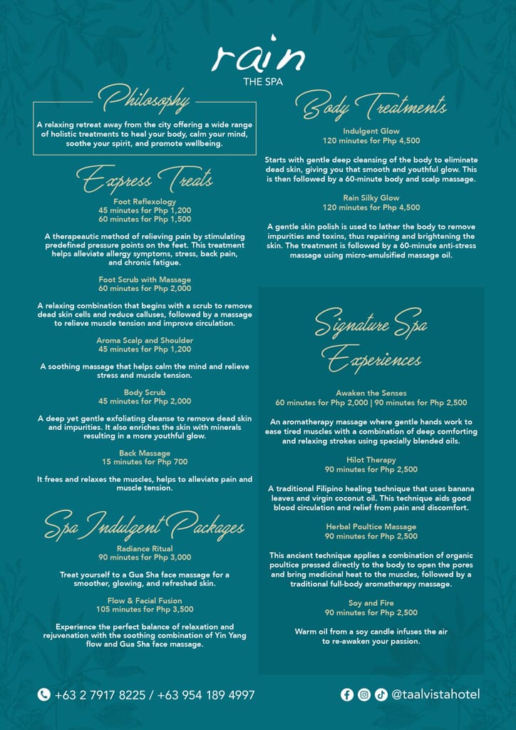 Taal Vista Hotel stands out above the rest among other properties in Tagaytay. Hotel facilities include a large outdoor swimming pool hidden from view to provide privacy. To help you give an energy boost or complete your fitness regimen, there’s an onsite gym. Looking for some entertainment? Tagaytay Hotel Vista has its own kid’s corner and games room. For complete relaxation, Rain, The Spa offers rejuvenating body treatments. Before leaving Tagaytay, check the hotel Cake Shop or Kultura Butik for some souvenirs. Taal Vista Hotel has hotel facilities other Tagaytay properties don’t have.